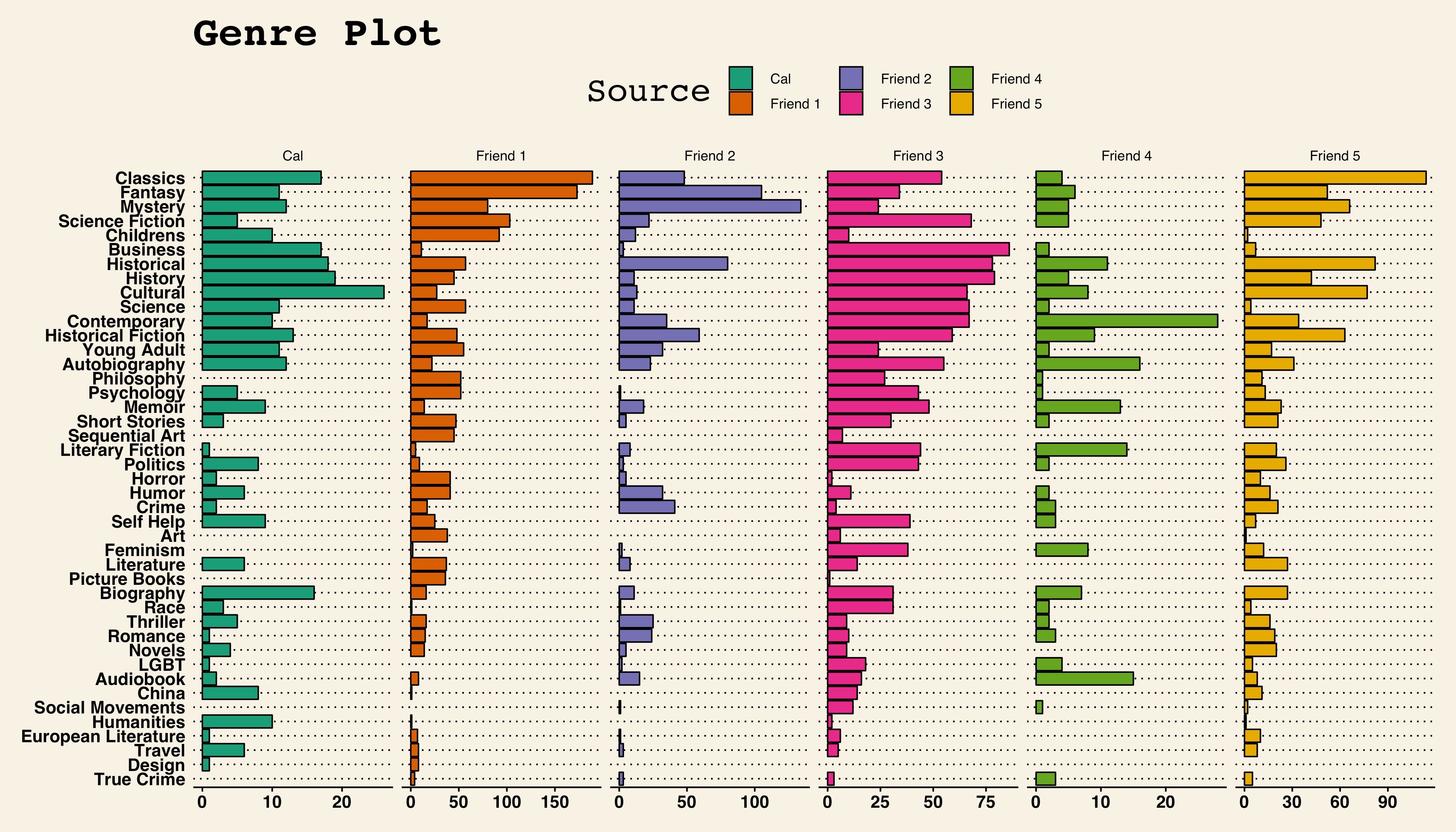Plotting out the distribution of read genres among multiple individuals taught me a lot about what I’m reading, what my friends are reading, and what we are not reading. Most conspicuous for me are the genres that are blank — Philosophy, Sequential Art (Graphic novels or comic books), Art, Feminism, Picture Books, Social Movements and True Crime. If you had straight up asked me, “Cal, do you read books about art?” I would have known no, I do not. But had I not seen this, I would not even have considered reading books about art to be a thing. To me, this is the real value of a crowd-sourced database like Goodreads, but not the direction that Amazon has been taking it. While it is primarily used to recommend new books similar to what you have enjoyed before, it can be used to show areas of literature that have been completely outside your purview.